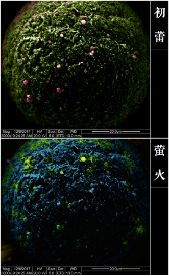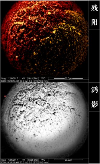 一等奖作品简介:纳米NiP颗粒附着的Ni基多孔粉末形貌图片利用Photoshop软件进行一系列细节调整后,展现了四个季节的轮转变化,分别为:初蕾(春)——花蕾初绽;萤火(夏)——夏夜流萤;残阳(秋)——草木衰败;鸿影(冬)——冰雪覆盖。希望观者能感受到一点“微尘藏乾坤”的意味。