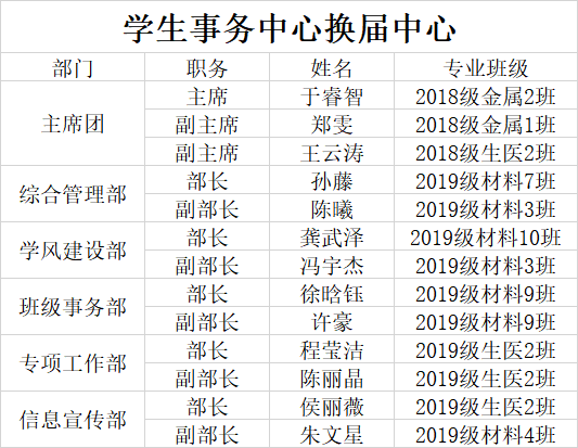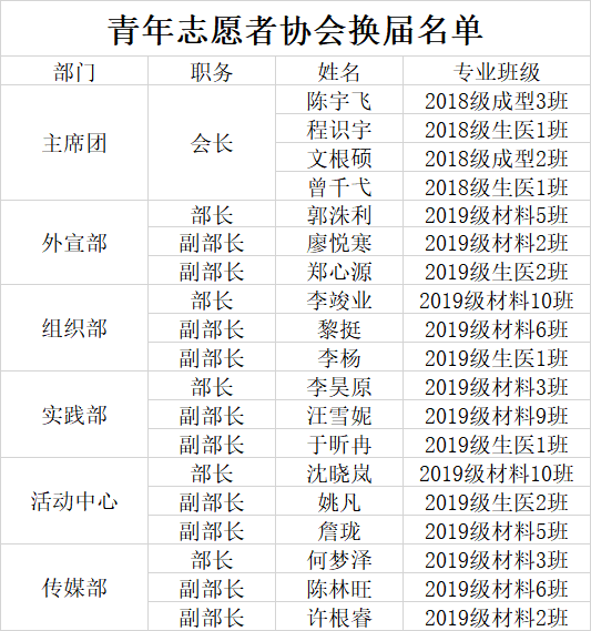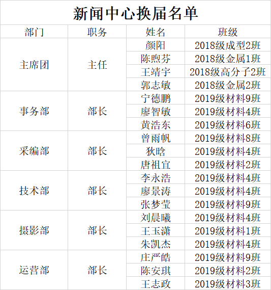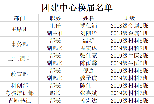 经过为期两周的学生自主申请、线上答辩、民主投票,现将今日看料 团委部分学生组织(团建中心、青年志愿者协会、今日看料、事务中心)换届结果公示如下: