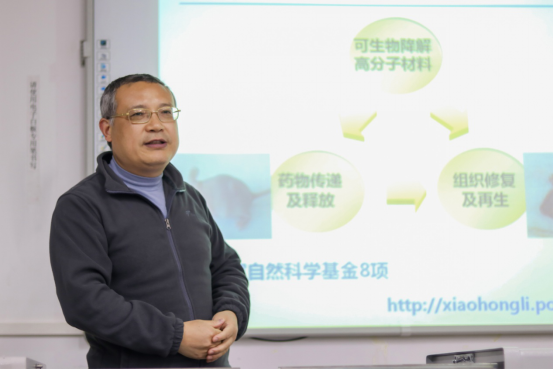第二位上台宣讲的是李孝红教授。李教授开门见山,先介绍了自己追逐学术的生涯,向各位阐述了自己的主要研究的方向,即可生物降解的高分子材料在药物传递及释放、笔记组织修复及再生的应用。为了便于让大家理解,李教授以治疗糖尿病为例具体阐述了该高分子材料的具体应用。关于培养学生方面,教授总结了三句话:引导学生的学术生涯,训练学生的创新思维,培养学生的科研方法。