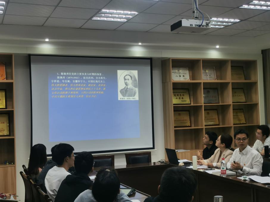 团课第二项:中国共产党百年奋斗历程与历史启示。黄德明主要从三个时期和一个启示对其进行论述:新民主主义革命时期、社会主义建设时期、改革开放和社会主义现代化建设新时期和历史启示。黄德明以时间为顺序,向团员们介绍了各个时期党的主要负责人对共产主义的探索工作以及社会主义现代化建设的大胆尝试,并在谈到社会主义建设时期时,黄德明还分享了许多关于改革开放的小故事,引发了团员们的兴趣,团课更具活力。