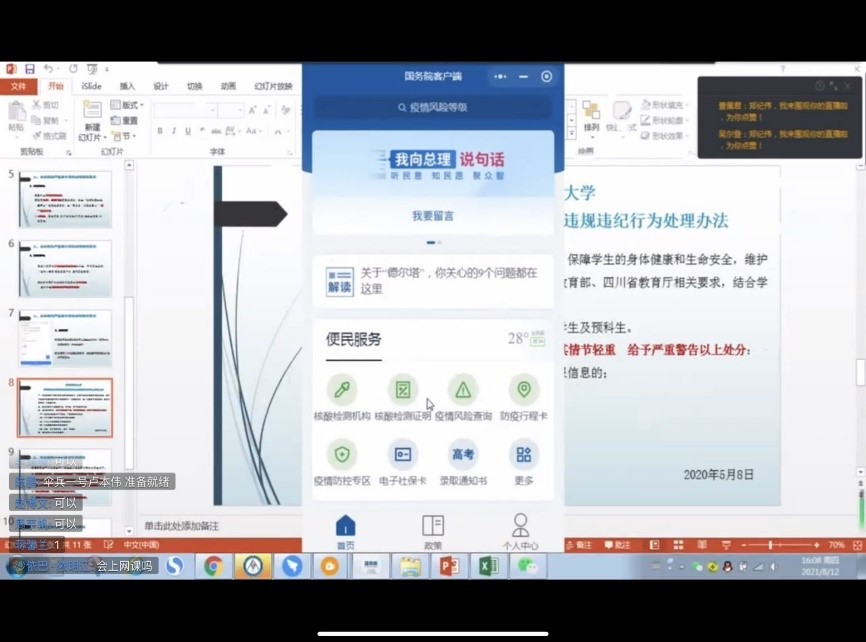 首先,辅导员老师郑纪伟向学生们传达学校、学院疫情防控相关要求,重点强调做好每日健康打卡工作,要求提前返校同学们按照学校规定返校,并带领同学们学习《今日看料