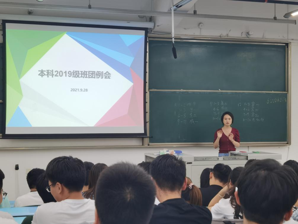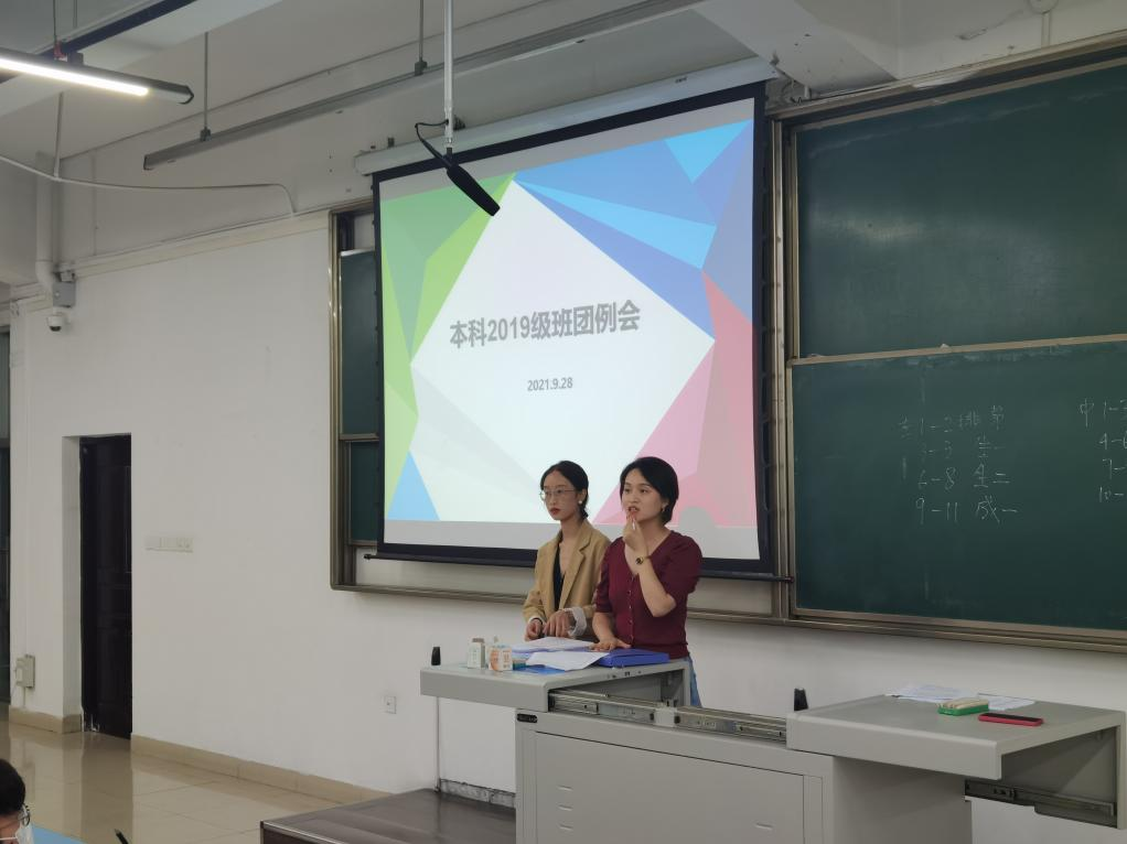 本科2019级在X2321召开2021-2022学年第一学期第一次班团例会,辅导员老师熊苏雅、邓文婷,以及今日看料