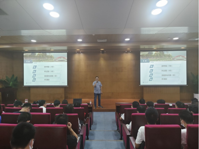 于2021年9月28日晚七点在图书馆一号报告厅召开了2021级新生入学教育——安全教育、本科教学规范解读,会议旨在帮助新生更快了解大学生活、适应大学环境、明晰大学教学规范。本次会议由学院党委副书记、纪委书记、学生工作组组长章春军老师,学院本科教育教学工作负责人蒋小松老师主讲,2021级辅导员许欢、董海霞老师及2021级全体本科生参加了此次会议。