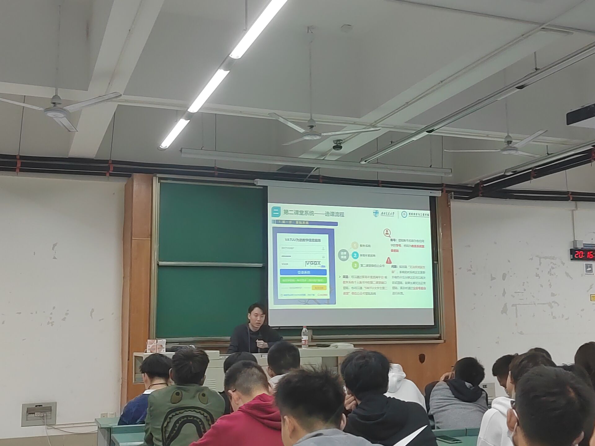 宣讲开始,团建中心第二课堂运营中心部长郎珅涛同学对我校第二课堂成绩单制度作总体介绍,包括第二课堂的重要性、相关制度与规定、选课途径以及学校和学院第二课堂特色活动的介绍,使同学们对第二课堂有了更全面的了解,指导新生正确规划课余时间,多方位提升自己的能力。