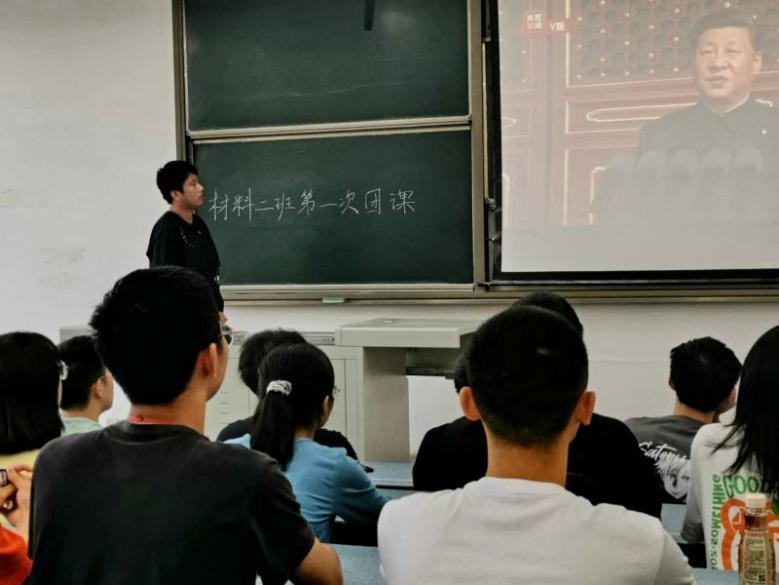团课开始,由歌喉婉转的贺译庆同学带领大家合唱《光荣啊,中国共青团》,同学们群情激昂,引吭高歌。合唱暂歇,张艺玟同学庄严宣读《团团致四川学子的一封信》。