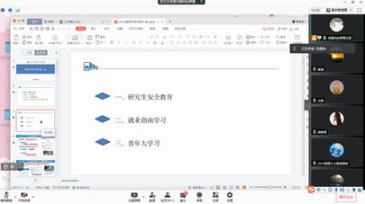 本次会议主要从研究生安全教育、就业指南学习以及青年大学习三个方面开展。首先,范老师在会上提出了学业安全、实验室安全、政治安全、意识形态安全、宿舍安全以及疫情防控安全等14项需要同学们注意的安全问题。强调:一、在实验室里需要严格遵守实验室的各项要求以及规定,生命至上,安全第一;二、应排查寝室安全隐患问题,不允许私接电线以及乱接插线板至床上等行为;三、对于冬季新冠疫情反弹现象,我们应加强防控,需要出省的同学需要按规定请假,做好核酸检测工作。