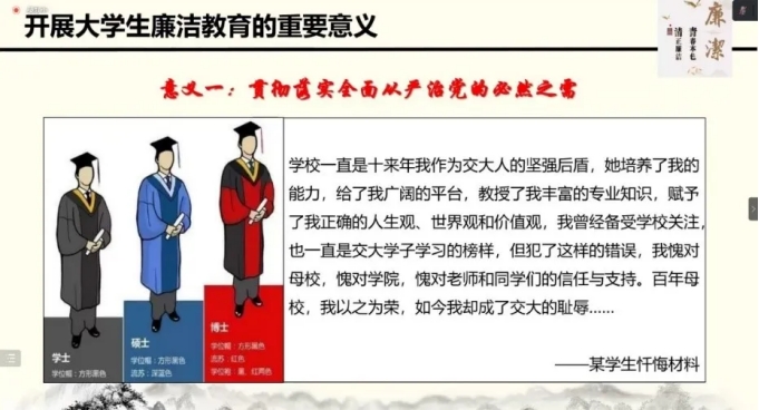 胡博老师以典型事例为据,提出在校园倡导廉洁文化是适应时代发展,是烘托优良校园文化氛围的必要举措。并指出官僚气息误导青年的本质原因是趋名逐利的不良风气,由此提出了推行廉洁文化、引导学生学习廉洁文化对塑造大学生正确的价值观,人生观的重要意义。