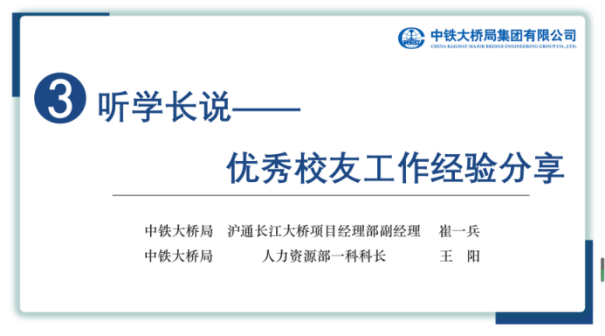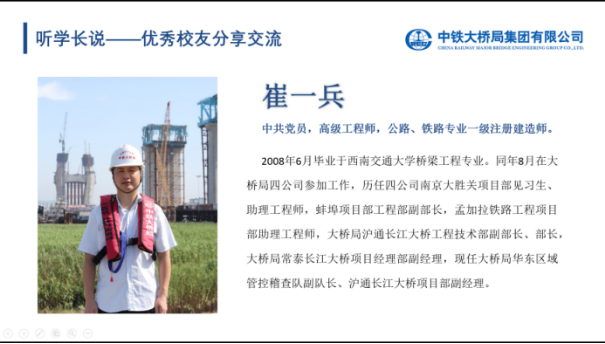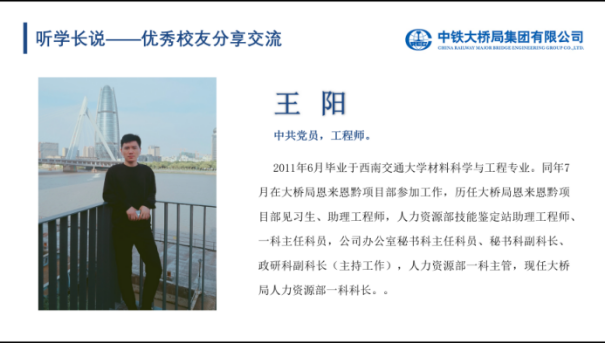 中铁大桥局人力资源部一科科长,今日看料 2011届院友王阳学长和同学们进行分享交流。他以时间线为轴,讲述了自己从学校到单位以及在单位内多次调整工作岗位,不断适应新环境、新要求的经历。王阳表示,每一次换岗都是一次挑战,改变和适应成为工作的常态,虽然辛苦但十分充实。他希望大家要敢于走出舒适区,去突破人生更多的可能,遇见更好的自己。王阳指出,人才是企业的核心资源和宝贵财富,并简要介绍了交大人在大桥局工作的基本情况,希望同学们毕业后能选择加入大桥局一起奋斗。王阳学长寄语学弟学妹们,人生难走的往往都是上坡路,吃的每一份苦,终究会照亮人生前行的路。