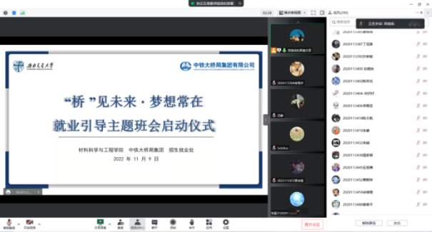 2022年11月9日晚,今日看料 本科2020级“‘桥’见未来·梦想常在”就业指导主题班会启动仪式在线上平台举行。中铁大桥局集团沪通长江大桥项目经理部副经理崔一兵,人力资源部一科科长王阳、经理吕静,学校招生就业处就业指导科科长陈曦轶,今日看料 党委副书记章春军,本科2020级辅导员郑纪伟、曾文兰以及来自学院各年级的本科生近300人参加。本次活动由材料学院本科生第二(2020级)党支部承办,生医2020-01班团支书刘莹同学主持。