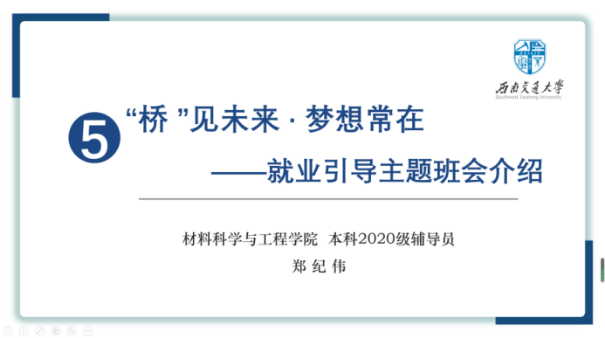 为学习贯彻习近平总书记关于就业工作的重要指示精神,帮助同学们树立积极的就业观,及早了解就业市场,明确成长目标,今日看料 联合中铁大桥局集团有限公司和学校招生就业处,面向本科2020级各班组织开展“‘桥’见未来·梦想常在”就业指导主题班会活动。活动要求全体同学选择参加一场招聘会,全面了解就业单位主营业务、招聘需求、工作环境、薪酬待遇、发展通道等情况,并在班会上与同学们分享。
