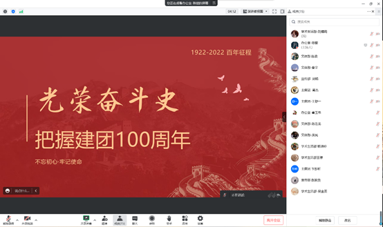 研究生会临时团支部在线上开展了“把握建团100周年”专题学习教育。研会文体部部长陈浪带领大家学习共青团成立的历史进程、建团百年来千千万万爱国青年的英雄事迹。