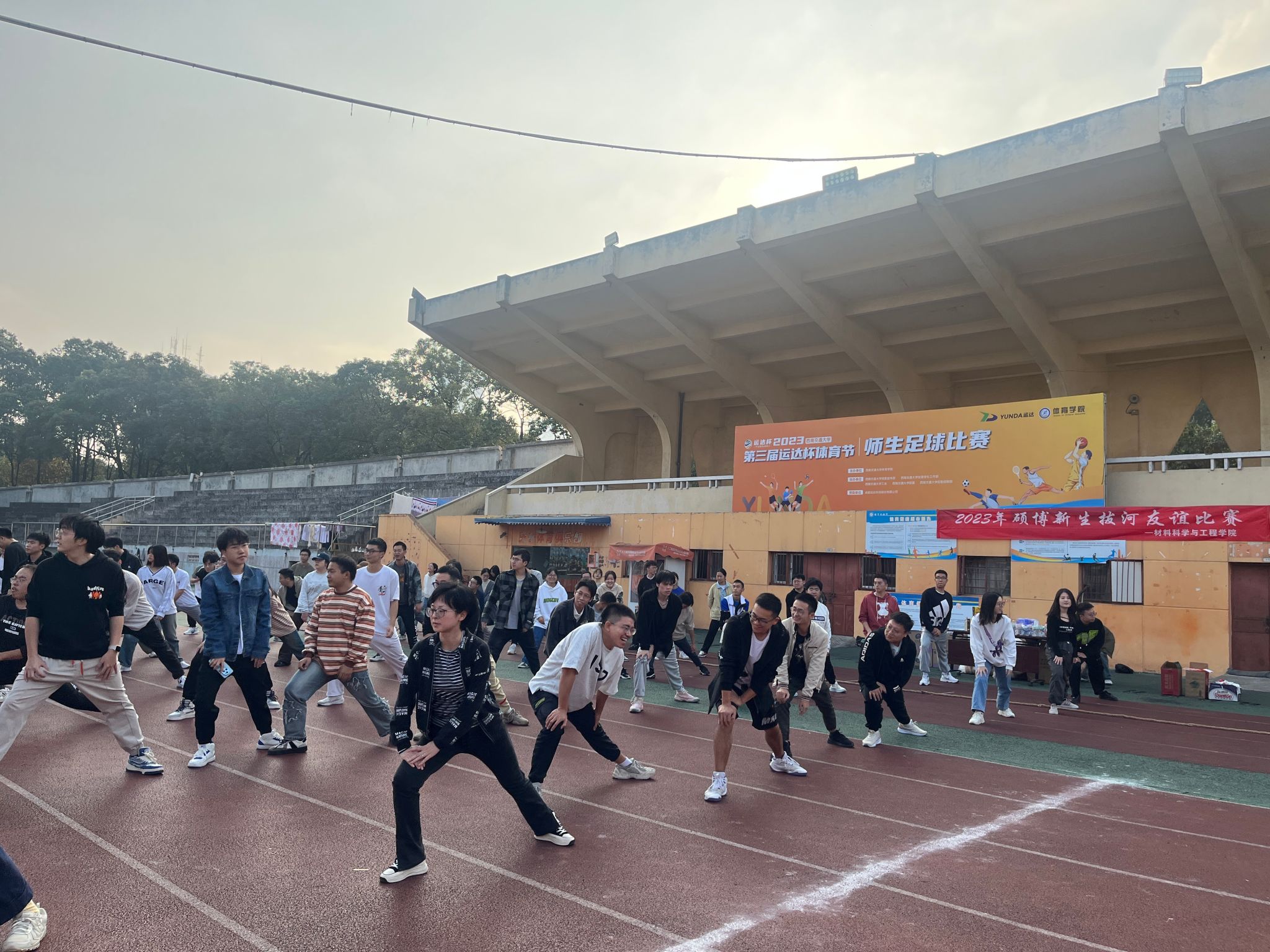 为了防止同学们在比赛中受伤,在比赛开始之前研会的工作人员带领老师和同学们进行了热身运动,为后面激烈的拔河比赛做好充足的准备。