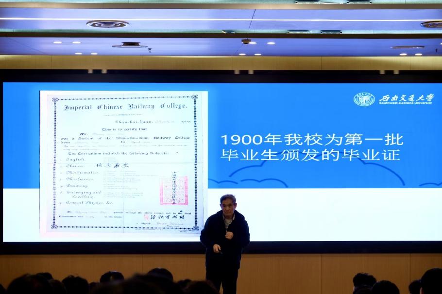 梁教授以“从岁月中走来,向未来中走去”为主题,结合珍贵的校史照片、文献资料和亲身经历,生动讲述了学校自1896年创办以来的关键发展节点。从初创榆山的艰难探索,到扩建犀浦的逐步壮大;从学科专业的迭代升级,到人才培养成果的不断涌现;从优良校风的积淀形成,到百年精魂的传承铸造。一个个鲜活的故事、一组组翔实的数据,“竢实扬华,自强不息”的精神煜煜生辉,让在场学生深刻感受到学校一百二十九余载的厚重底蕴与奋斗精神。
