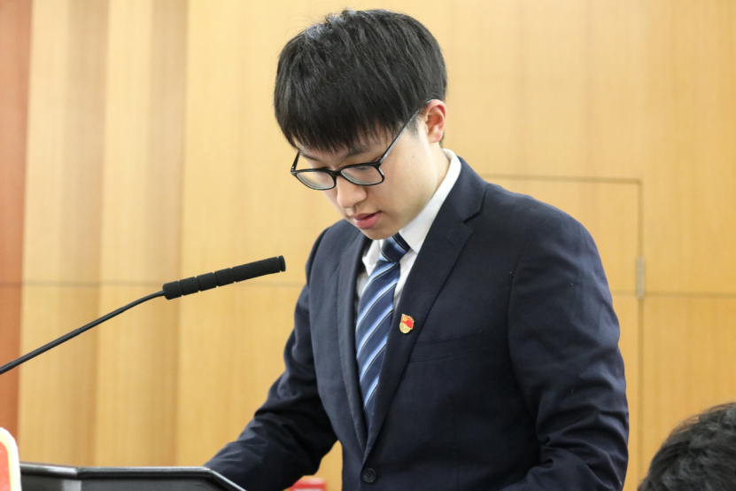 开幕式进行第三项,校团委副书记、校学生会主席赵天胤致辞,体现了团学代表应秉持从学生中来,到学生中去的精神。
