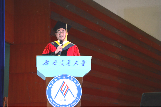 才有了今日的辉煌成就。最后,朱旻昊教授送给了毕业生三颗心,一,光明正大,表里如一,要有与人为善的诚心;二,时不我待,求实创新,要有敢为人先的决心;三,天道酬勤,厚德载物,要有坚持不懈的恒心。愿材料学子们带着这三颗心,身披交子的荣耀,去做人生的王者,去做知行合一的奋斗者。