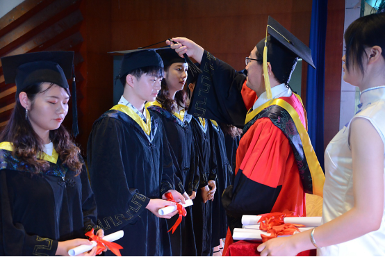院长、学位评定分委员会主席、毕业典礼的主礼教授朱旻昊为毕业生行拨穗礼。授位仪式——神圣而庄严,象征着大学生涯的结束,标志着大学学习圆满里程。拨穗正冠,代表稻穗或麦穗成熟,象征学子们已学有所成,即将展翅高飞,同时也寓意学子们在岁月的征程中行稳致远。