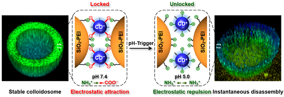 为此,周绍兵教授团队设计了一类动态复合胶体囊(colloidosomes),该微囊依赖于一个可逆而灵巧的静电作用策略,兼具可靠封装与超快释放能力。该团队以聚乙烯亚胺改性的二氧化硅纳米颗粒(SiO2-PEI NPs, 22 nm)和两性离子型碳点(CDs, 5.5 nm)为单元粒子,通过Pickering乳液自组装一步制备载货微囊。在pH 7.4时,正电性SiO2-PEI NPs与负电性CDs以静电吸引力组成牢固的微囊壳,高效封装内容物;在pH 5.0时,由于表面功能基团质子化,碳点电荷迅速反转,成壳粒子间由静电吸引(拉)突变为静电排斥(推),使囊发生瞬间解体从而快速释放内容物。以异硫氰酸荧光素标记的葡聚糖(10000分子量)为模型药物,其包载率和包载量分别达到86.9%和24.3%,在储存状态下1个月仅渗漏5.5%,而一旦触发于5分钟内几乎完全释放(>90%)。以具有生物活性的酶分子为模型药物证明,该体系生物相容性高,酶活性保持良好。