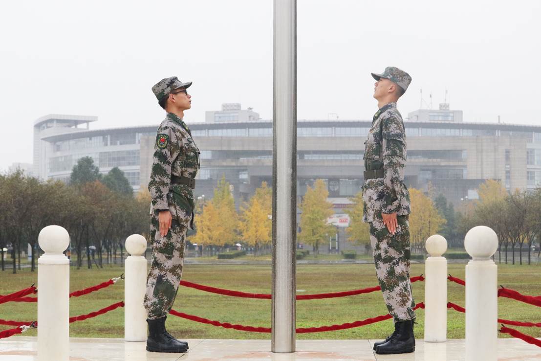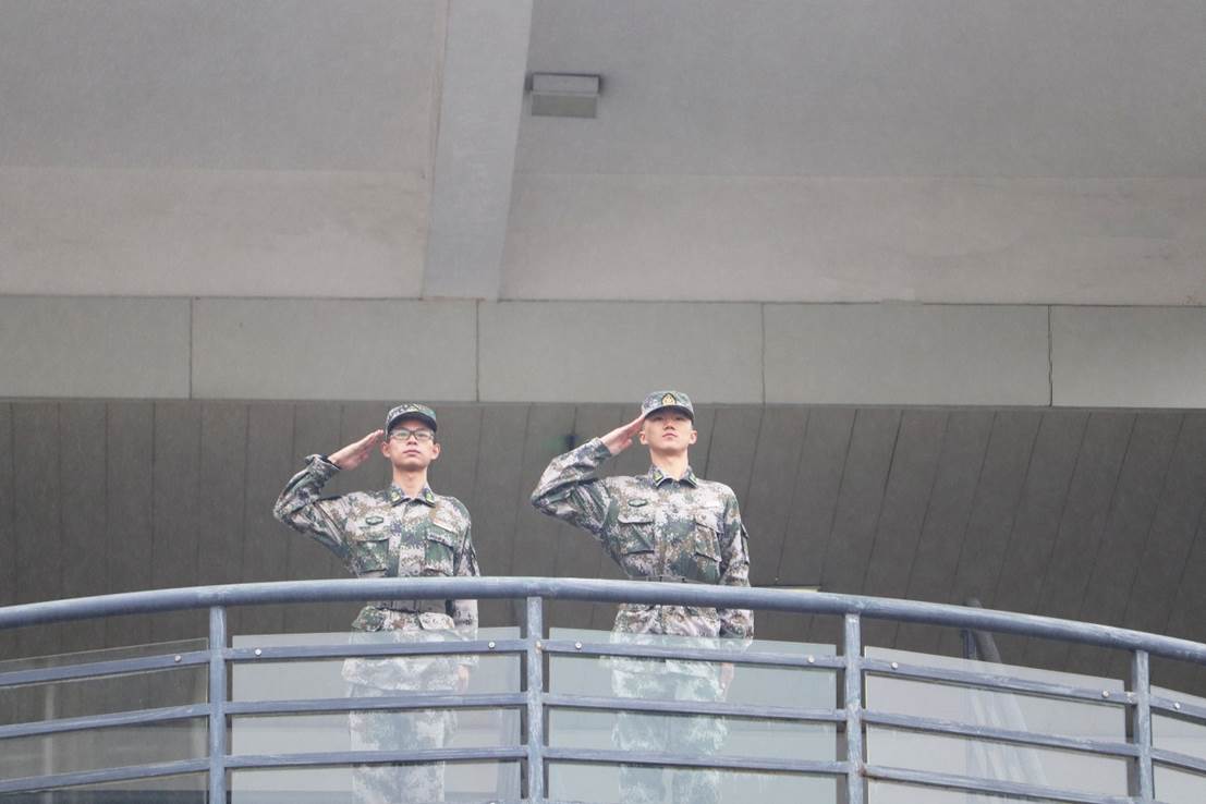 当谈到国旗班的训练时,两位学长说道,包括站军姿、单个军人队列动作、持枪、擎旗以及体能训练等等。最让两人难忘的是体能训练,兄弟们一起冲圈、俯卧撑、仰卧起坐等等,虽然很累,很痛,但“痛”说明你在成长。这锻炼了国旗班的团体意识,磨练毅力、耐力的同时增强了凝聚力。所有人都凝聚起来了,一个真正的国旗班才能诞生。作为国护人,守护国旗是荣誉,更是责任——把时时刻刻守卫国旗的精神风貌传承下去,让更多的人了解国旗文化。“以我火红青春谱写国旗礼赞,以我热忱生命捍卫国旗尊严”,这早已不再只是一句口号,而是对国旗班热血男儿的真实写照。