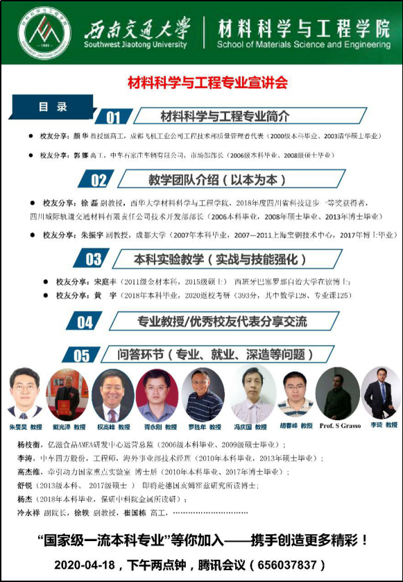 为在疫情期间切实做好2019级材料类本科生的专业分流工作,帮助2019级本科生了解材料科学与工程专业优势特色,选择更适合个人发展的专业方向,根据学院统一部署,2020年4月18日下午2点,金属材料系通过腾讯会议平台组织开展了材料科学与工程专业(金属与无机非金属方向)的专场宣讲。
