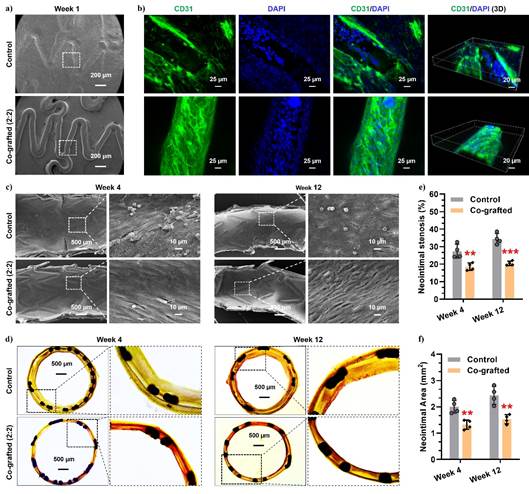 图2. 通过可生物点击贻贝仿生多肽构建的双功能血管支架具备快速表面内皮化并长期抑制内膜增生和支架的再狭窄。