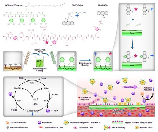 图1. 可生物正交贻贝灵感多肽模拟物的分子结构及其应用于血管支架的表面改性。