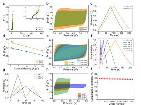 图4. DACFs对称超级电容器在6 M KOH电解液中的电化学性能。a EIS曲线。b 扫描速率为50 mV s-1时的CV曲线。c 电流密度为0.5 A g-1的GCD曲线。d 不同电流密度下的质量比电容。e 扫描速率为20-500 mV s-1时的CV曲线。f 电流密度为0.5-20 A g-1的GCD曲线。 两个器件串并联所对应的g GCD曲线和 h CV曲线。i 电流密度为2A g-1的DACFs所对应的循环寿命。