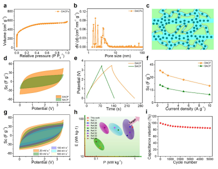 图5. DACFs对称超级电容器在EMIMBF4离子液体电解液中的电化学性能。a N2吸脱附曲线。b 孔径分布。c DACFs孔径分布的示意图。d 扫描速率为50 mV s-1时的CV曲线。e 电流密度为1 A g-1的GCD曲线。f 不同电流密度下的质量比电容。 g 扫描速率为20-500 mV s-1时的CV曲线。h Ragone图。i 电流密度为2A g-1的DACFs所对应的循环寿命。