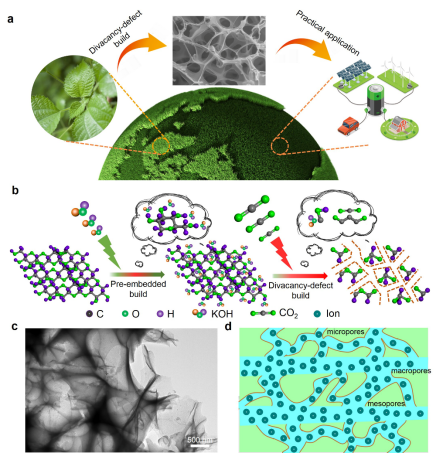 在本工作中,我们展示了一种层级双空位缺陷构建平台高效制备高度互联互通的三维多孔碳纤维的技术。我们发现这些独特的空位结构不仅表现出较高的比表面积(1529 m2g-1),而且建立了合适的孔径分布,进一步有效地创造了丰富的可供离子相互作用的活性位点,有效地增加了离子的存储空间。此外,在EMIMBF4离子液体电解质体系中,器件展现出高达38.2 F g-1的质量比电容和61.3 Wh kg−1的能量密度(对应功率密度为875 W kg−1)。研究者相信,此项研究提出的分子预嵌技术以及层级双空位缺陷构建技术一方面将会为碳纳米材料的空位构建提供一定的解决思路,另一方面为基于多孔碳材料内嵌的金属纳米颗粒、易氧化的Mxenes以及不稳定的钙钛矿材料的铆接打开了一扇新的窗户。