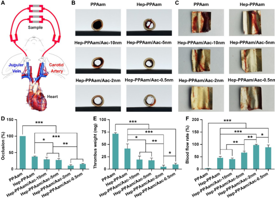 图2. 负载肝素的等离子交替涂层改性的不锈钢表面实现了优异的抗凝血性能。