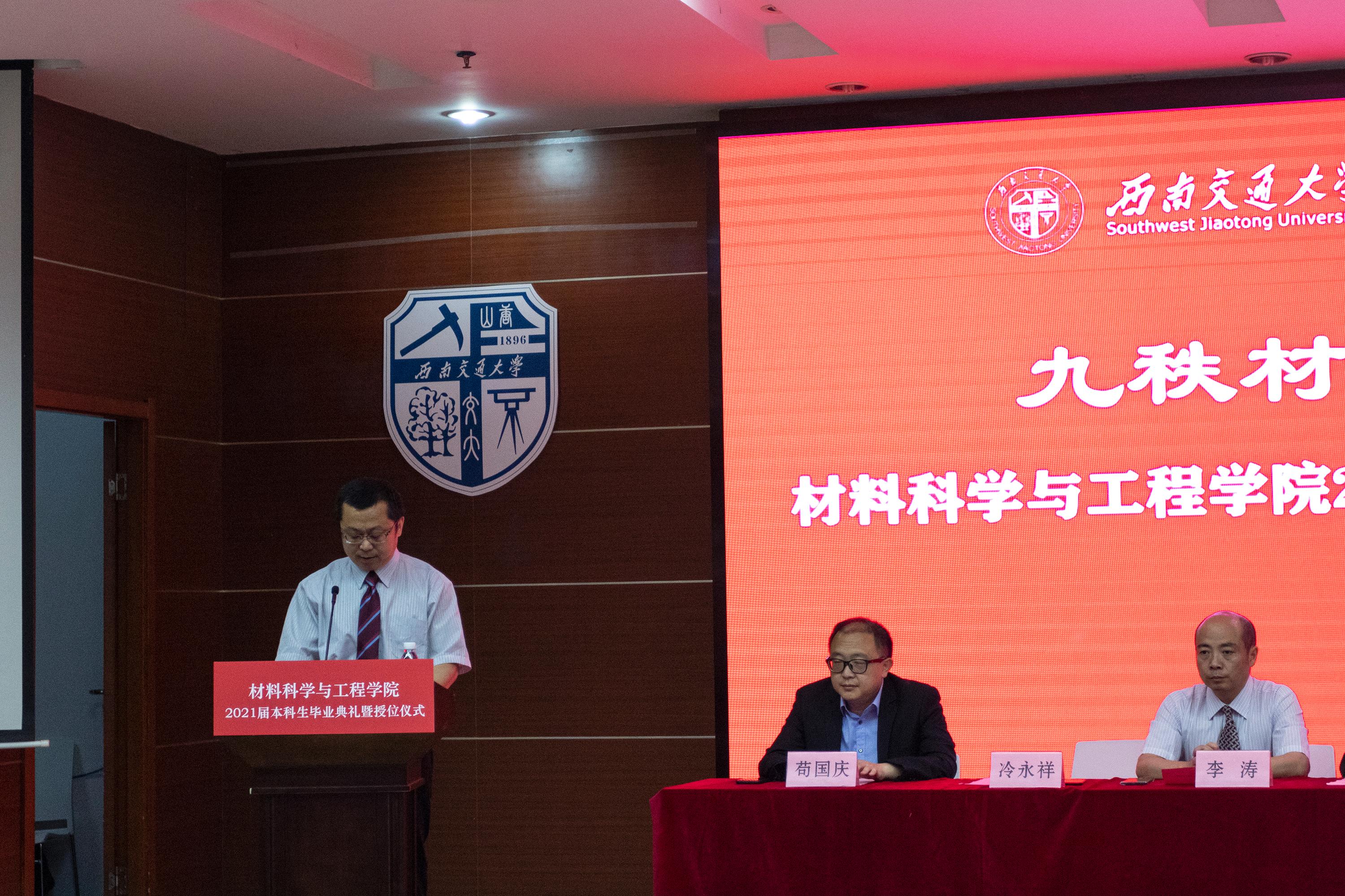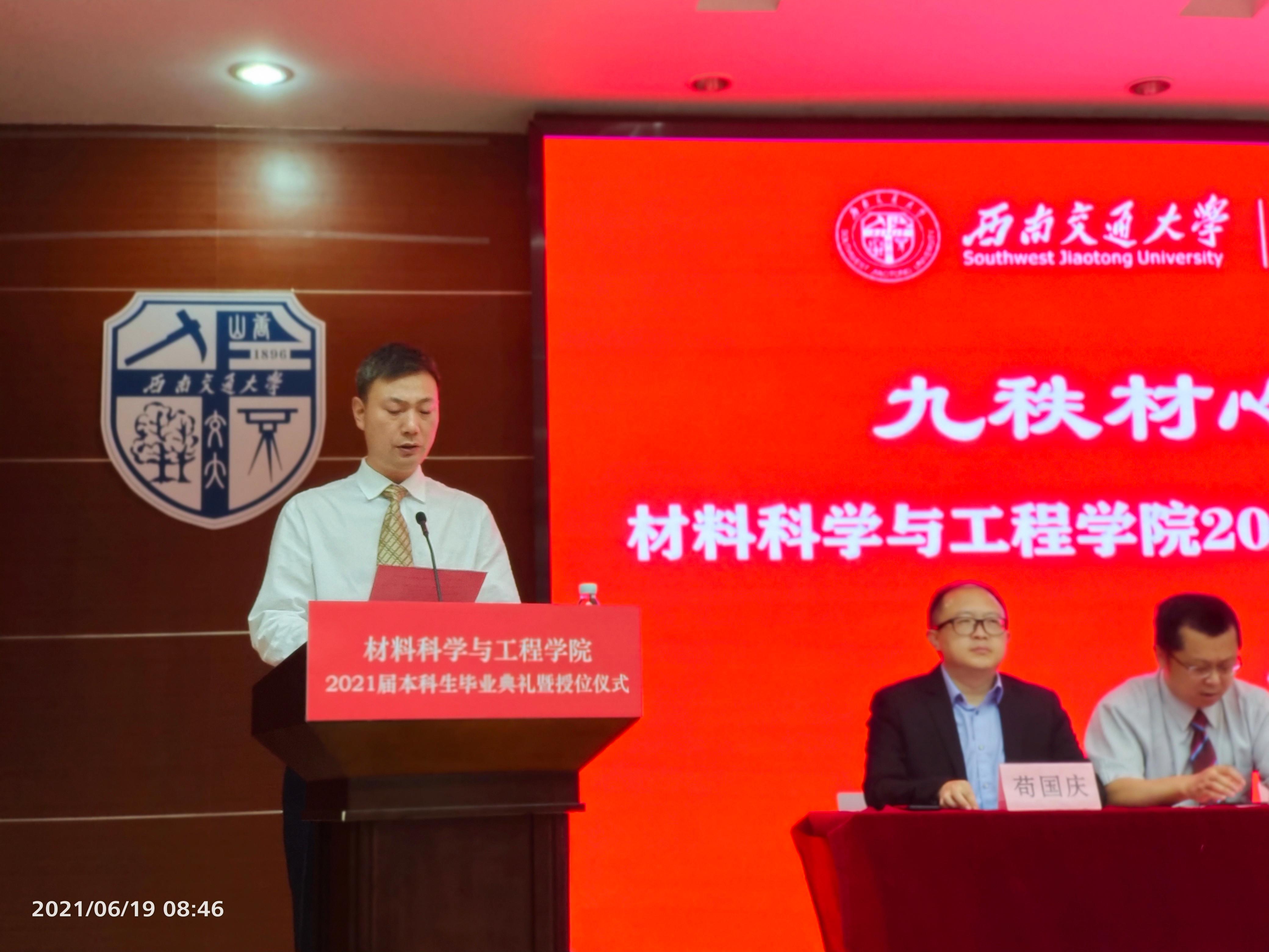 党委书记陈勇向毕业生致辞。陈书记首先代表学院师生祝贺2017级同学们顺利毕业,同时他表示很幸运能够见证同学们的成长,学院通过楼长制和“七个深入”等工作,重视把深入学生、联系学生和服务学生工作落到实处。他提出了三点建议:一是以神舟飞船发射成功、有效抗击新冠疫情、全面建成小康社会等案例,阐述了我国社会主义制度的优越性,告诫大家无论何时何地,都要永怀一颗赤忱之心,做到爱党爱国;二是做到严格要求自己,秉承交大“双严”传统,保持自律积极、奋发向前的好状态;三是要懂得坚持,希望同学们明确目标,不急功近利,学会坚持,以一砖一瓦建造好人生大厦。