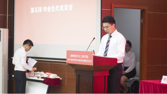 再次,毕业生代表2017级成型2班杨峰同学发言。他以“奋斗、迷茫、收获、成长”为主题向大家分享了自己的大学时光,并饱含深情地说到——作为支教团成员,在党的百岁时刻奔赴社会,一定不辜负学校学院的期待,在需要的地方继续发光发热。情真意切的言辞中饱含对大学生活的留恋与不舍,对老师、家长、同学的感恩与感激。四年的时光,转瞬即逝,每个学子在交大实现了成长与蜕变,在心中留下了独一无二的回忆。