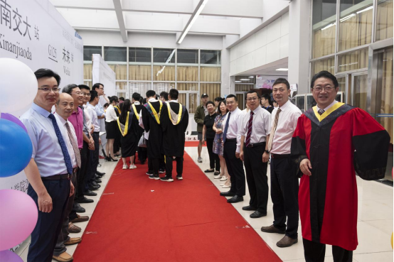 上午8:00,入场式正式开始,提前等候全体毕业生入场的老师们两边列队夹道欢迎,同学们顺着照片墙、结对步入红毯,与老师们逐一握手入场,在留言墙签下姓名,迈入典礼现场,入场式隆重、庄严而又温馨。踏上红毯,寓意着毕业生即将结束大学本科就读征程,也将开启人生新的征程。