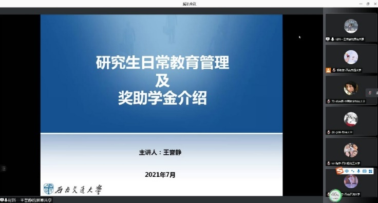 7月8日上午,王勇教授为同学们介绍了研究生培养方案和新生奖学金相关政策,辅导员王誉静老师为同学们介绍了研究生日常教育管理和奖助学金政策,加深了同学们对我院招生政策、研究生培养模式的了解。