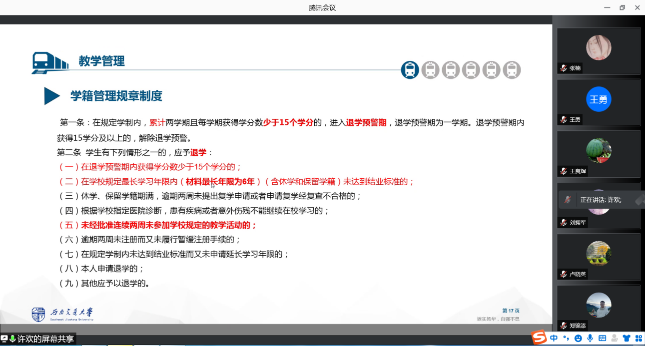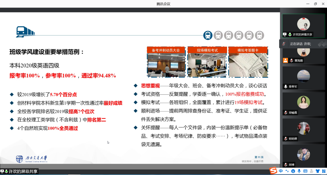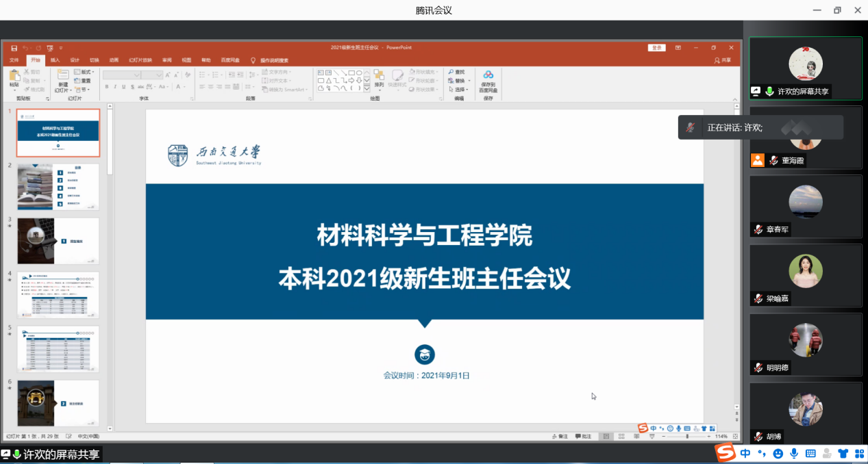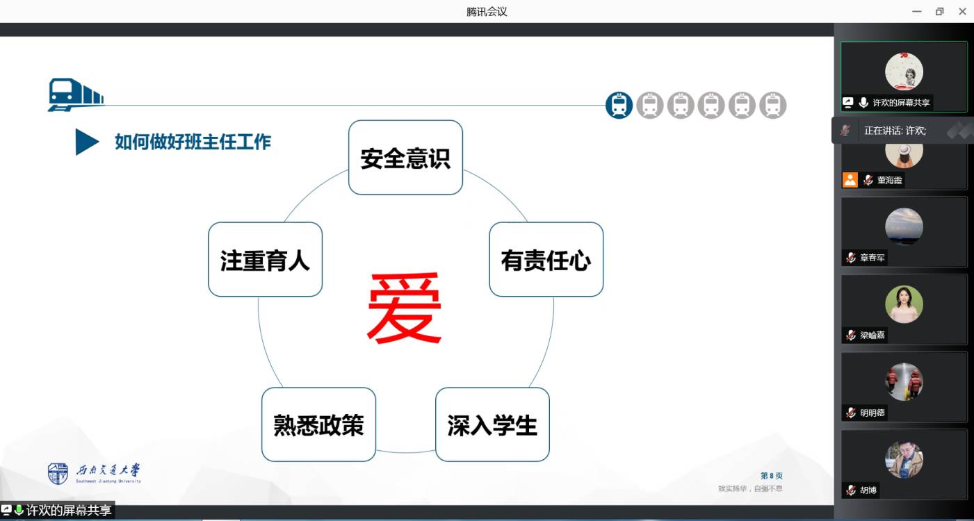 另外,许欢老师还解读了校院两级本科生管理的重要规章制度,确保各位班主任能够了解学籍管理、奖学金评定、新生晚自习等工作制度,并在工作中能高效合理开展工作。许欢老师还向大家介绍了今年的迎新系列活动安排,并结合今年疫情防控常态化工作要求,向老师们讲解了学生发热或疑似症状处置流程、体温每日三测三报、寝室晚点名、请销假等日常管理规定,着重提醒老师们做好疫情防控形势下的学生教育工作,梳理了近期重点工作清单,提醒老师们做好寝室走访、第一次班会等工作。