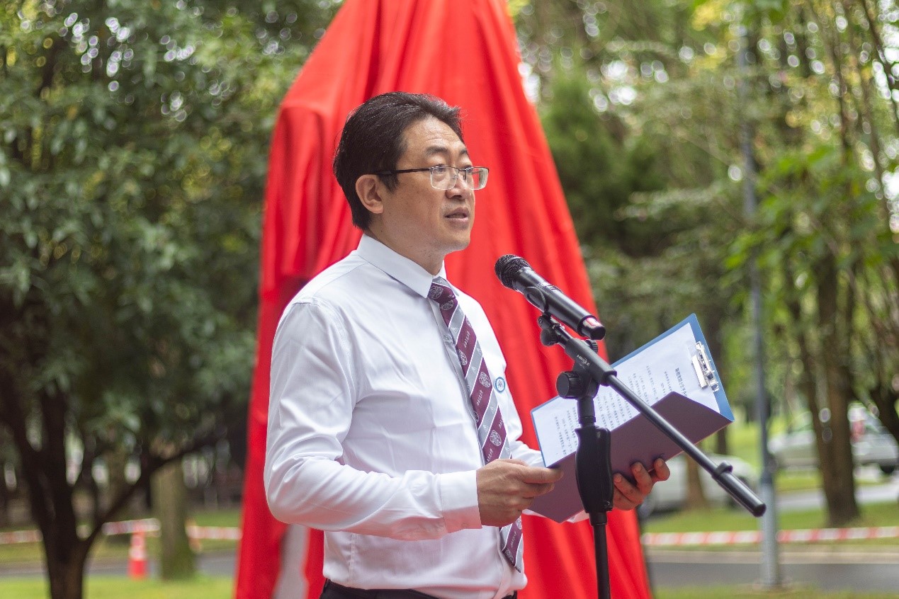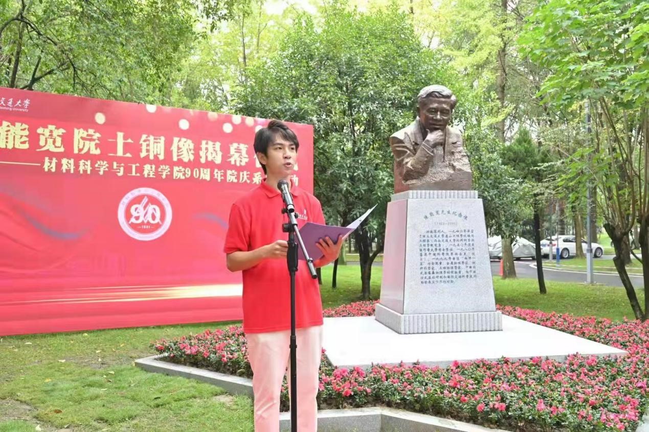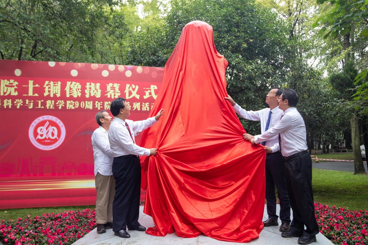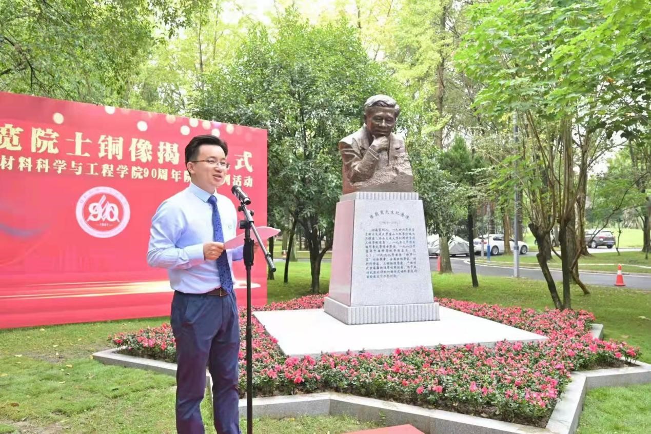 仪式第二项,由王顺洪、桂富强、朱旻昊、徐伯初共同为铜像揭幕。这是一个历史性的时刻,在场师生见证,交大材料人将在巨人的肩膀上继续前行。