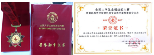 本届比赛是金相技能大赛的举办的第十年,组委会表彰了为该项赛事做出突出贡献的人员。我校王良辉老师因连续带队参加了七届全国金相技能大赛、组织发起四川省金相技能大赛、连续三年参与组织四川省金相技能大赛、并积极努力推进省赛进入四川省教育厅本科学生学科竞赛名录等卓越的成绩,被组委会授予全国大学生金相技能大赛十周年“一级荣誉勋章”。我校高国庆老师因带队参加第一次全国大学生金相技能大赛,被组委会授予全国大学生金相技能大赛十周年“二级荣誉勋章”。