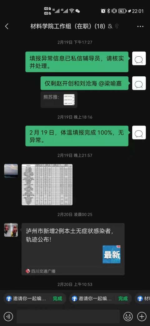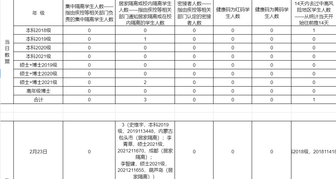 一是提前上岗开展工作。高度重视春季学期开学和校园疫情防控工作,做好对接,寒假期间常态化实现学生动态离校和返校工作的有序管理。学工组于2月初第一时间召开线上会议,做好全体同学每日健康填报工作的部署,全体辅导员自2月5日起正式进入线上办公状态,通过年级大会、班团例会进行健康填报和疫情防控工作布置部署,每天做好重点人员摸排和健康信息管理,学生健康填报连续17天实现“100%填报和100%无差错”。
