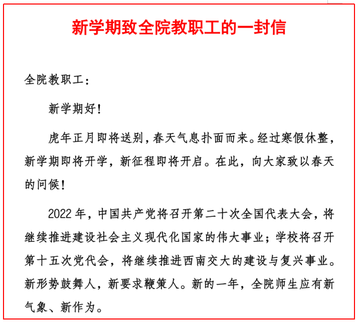 开学前三天(2022年2月22日),学院党委书记陈勇、院长朱旻昊共同向全院教职工发出一封信,强调学院2022年工作重心将着力“安全稳定、学科发展、民生工程”三大方面,重点推进“全面加强党建和思想政治工作”、“谋划和启动新一轮‘双一流’建设项目”、“着力加强师资(人才)队伍建设”、“精心布局和争取国家级奖项”、“继续优化教学科研和人才培养环境”五项工作。他们还提醒每一位教职工重视身心健康,加强身体锻炼;重视安全稳定,确保人身安全、政治安全、消防安全、财产(物)安全和保密安全等;重视师德师风,守师德底线奔师德高线。号召全院上下同心同德、同向同行,齐心协力推进学院改革建设发展,祝福大家身体健康、家庭幸福。