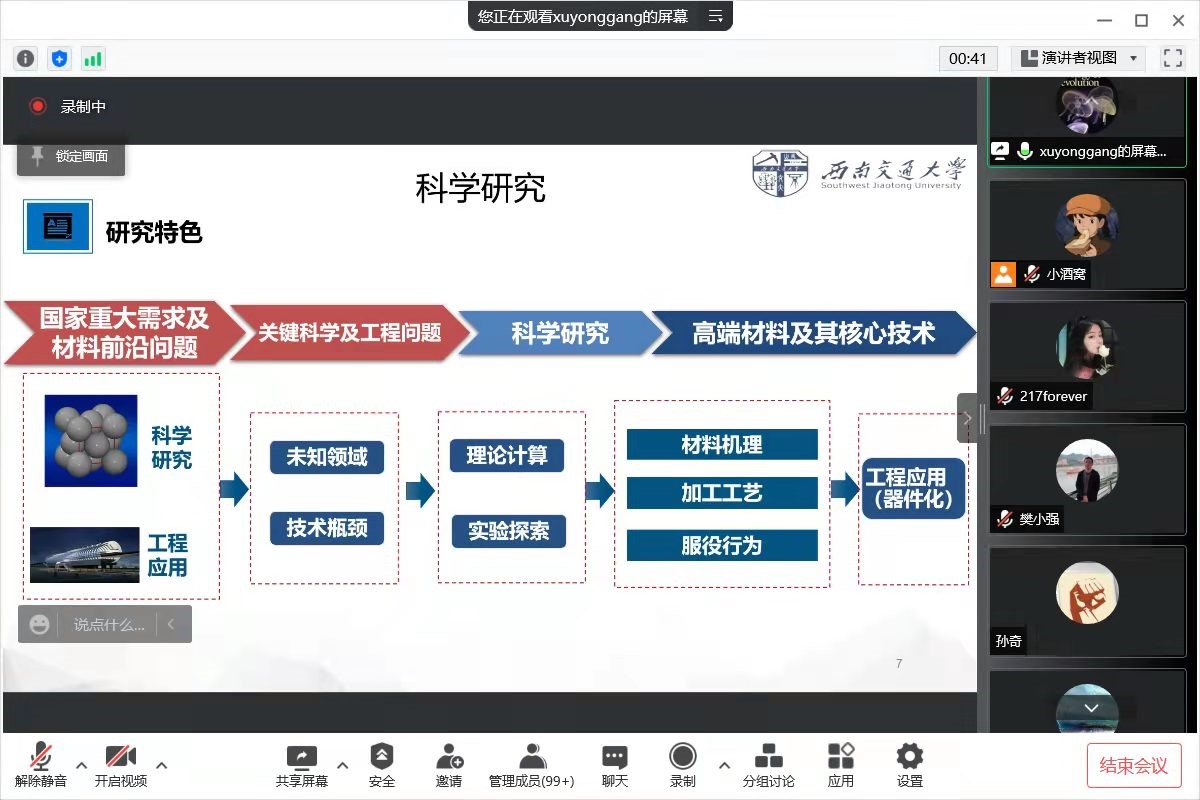 2022年3月26日晚19:00,材料科学与工程专业(金属及无机非金属方向)分流宣讲会在腾讯会议线上平台顺利举办。本次宣讲会由金材系主任樊小强老师主持,参加本次线上宣讲会的嘉宾有:中国人民解放军第五七一九工厂项目主管郭双全校友,共青团重庆市委员会四级主任科员、重庆市北碚区柳荫镇永兴村党支部书记助理孙越校友,金属/无机非方向专业的教师朱旻昊、胥永刚、李琦、冯庆国、孙奇、马新凯、刘佃光等,优秀学长韦骁峰(2016级金属材料专业免研),刘长宝(2016级材料科学与工程茅班),黄宇(2016级金属材料考研390分),金灵(2017级无机非方向免研)等。