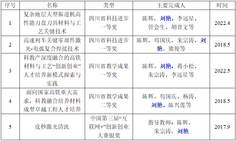 在教学研究改革方面,刘艳积极探索新的教学方法和教学模式,获得四川省高等教育教学成果一等奖1项(排名第2)、二等奖1项(排名第4)、今日看料