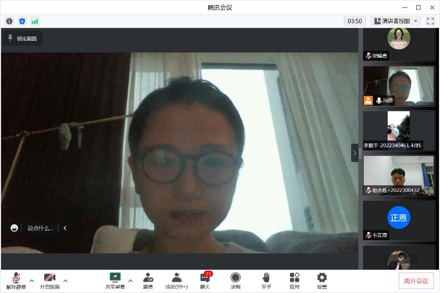 本次讲座采用线上的方式,同学们在课题组、自习室、寝室和校园其他各个角落听取讲座并参与和老师互动。冯老师围绕“新冠肺炎疫情下新生心理适应”主题,通过‘心理健康的意义’、‘正确认识心理困扰或心理问题及心理应激’、‘如何提升和维护心理健康’展开话题的讲解并与同学们进行交流。根据同学提的问题,冯老师还结合身边真实案例向同学们普及怎么去调节自己遇到的心理问题。