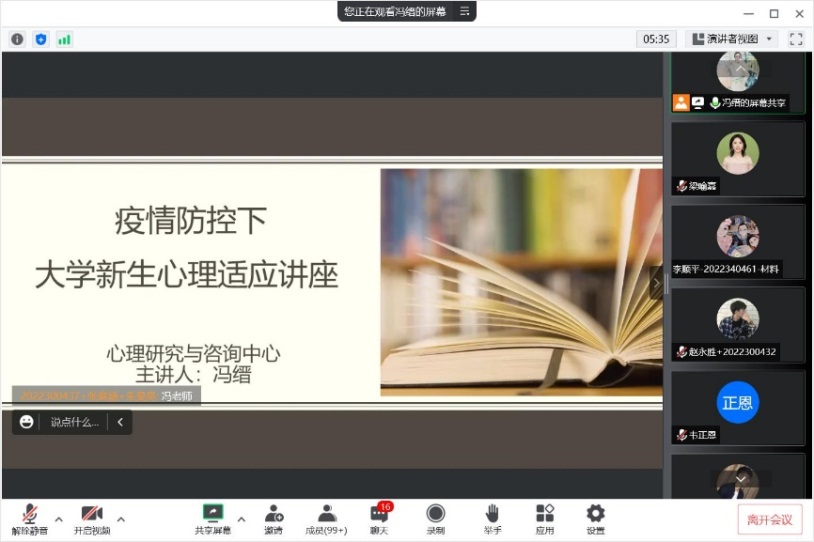 心理研究与咨询中心的冯缙副教授主讲,开展了主题为“新冠肺炎疫情下新生心理适应线上讲座”。受新冠肺炎疫情的影响,本次讲座采用线上的形式,在腾讯会议上进行,全体2022级研究生新生参会。