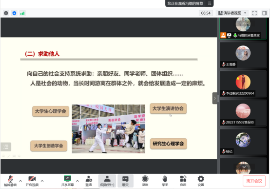 冯缙老师首先通过线上互动形式,调动同学们的积极性,在老师的提问得到同学们的热情回应后,冯老师对同学们表现出积极向上的态度予以肯定,并将讲座的内容有侧重的调整为帮助大家适应新环境里的新角色。她表示同学们在身份转变后,来到新的环境,有很多需要适应的地方,在某些时候同学们感到迷茫焦虑孤独甚至不合群,都是很正常的情绪。在这种情况下,拥有更多正向的心理健康知识作为支持,对于同学们来说具有重要意义。