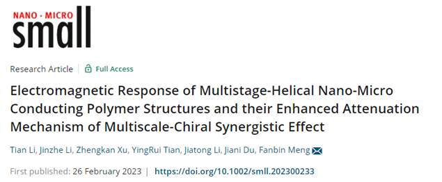 近期,我院2022级博士李天在国际高水平期刊Small上发表了题为“Electromagnetic Response of Multistage-Helical Nano-Micro Conducting Polymer Structures and their Enhanced Attenuation Mechanism of Multiscale-Chiral Synergistic Effect”研究论文,创新性阐明了多级手性结构的电磁响应模式和宽频调控机制。论文通讯作者为孟凡彬特聘研究员。研究工作得到了国家自然科学基金项目 (No. 51903213和No. 5217130130190)、四川省科技计划项目 (No. 2023NSFSC1952和No. 2022ZYD0028)、中央引导地方科技发展专项基金 (No. 2021Szvup124)和中央高校基础研究经费 (No. 2682021GF004)及相关国防项目的资助与支持。