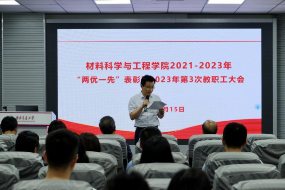 在九里校区3324会议室举办2021-2023年“两优一先”表彰暨2023年第3次教职工大会。会议由党委书记陈勇主持。陈辉院长及学院领导班子全体成员、教职员工、学生党员代表百余人参会。