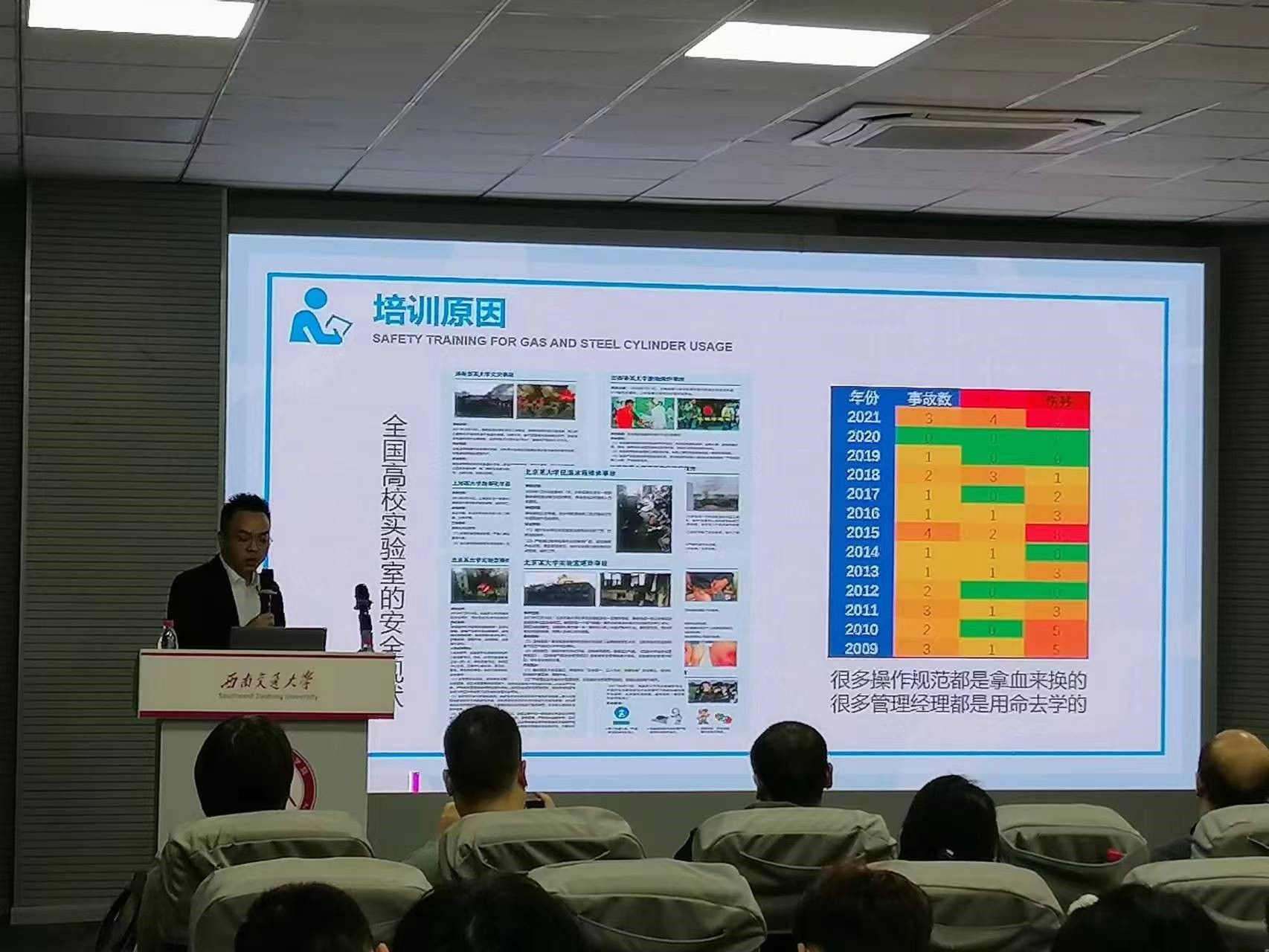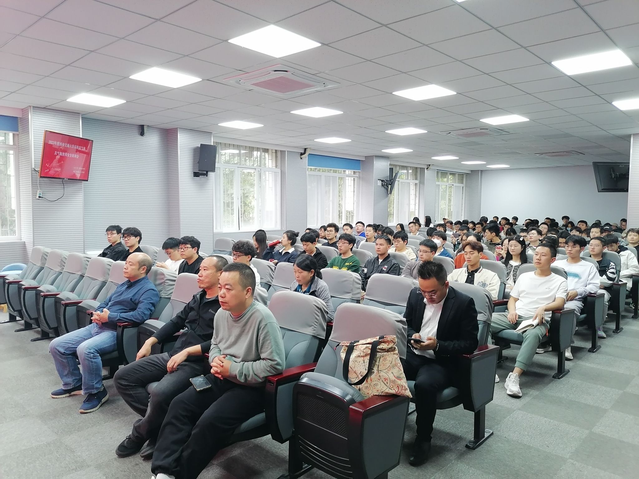 李涛常务副院长,资产与实验室管理处安全科王舒涵科长汪泽鑫老师,材料科学与工程国家级实验教学示范中心陈大志副主任,以及涉及有气体及气瓶使用的材料、土木、电气、化学、力航、医学、机械、物理等八个学院的安全员老师,实验室安全负责人,使用气瓶的学生共计120余人参加了此次培训。培训讲座正式开始前大家首先观看了《火车侠说安全》(实验室气瓶安全篇)的宣传片,接着李涛副院长结合自己多年分管实验室安全管理的工作经验和经历,强调了此次实验室气体及气瓶使用安全培训的重要性和必要性。