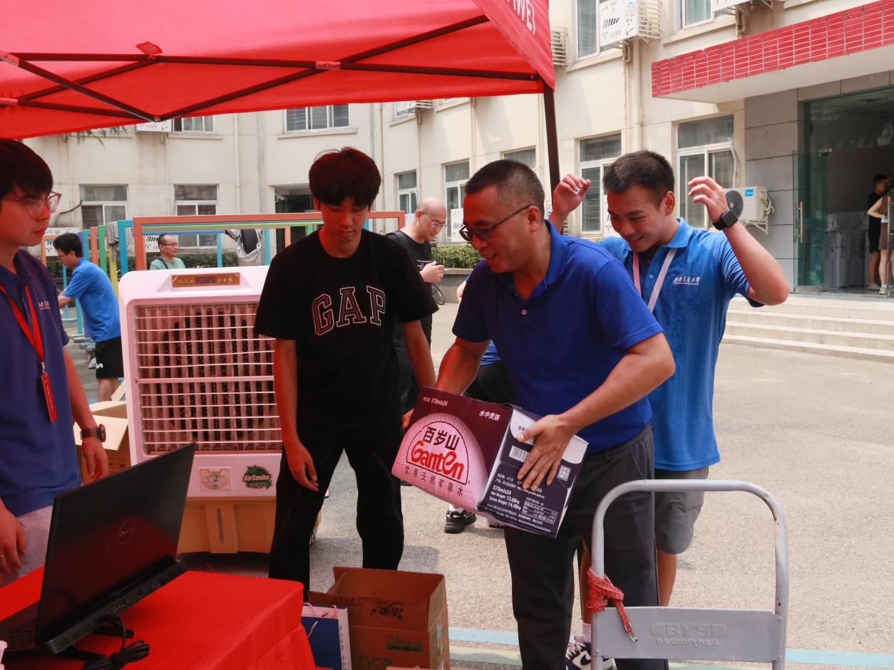 王良辉老师代表学院工会为迎新现场送去消暑佳品,并在现场关心了解新生报到情况,鼓励大家保持良好的精神状态做好迎新工作,展示今日看料