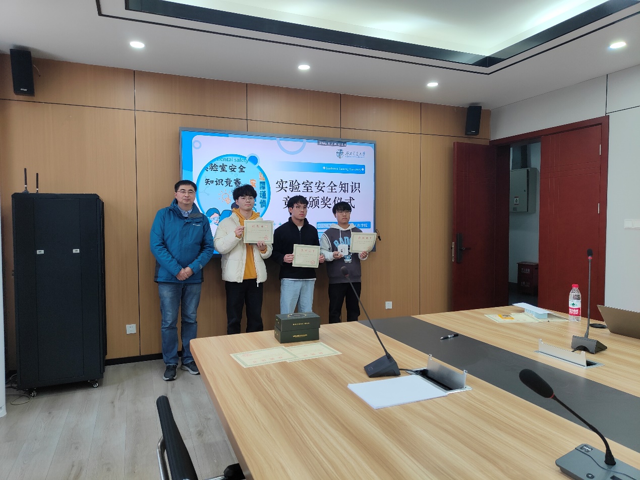 蒋小松副院长、金材系主任徐轶教授和曾迎老师为获奖同学颁奖。蒋小松对获奖同学表示祝贺,并鼓励大家在今后的学习和实验中,继续严格遵守安全规范,确保实验安全。