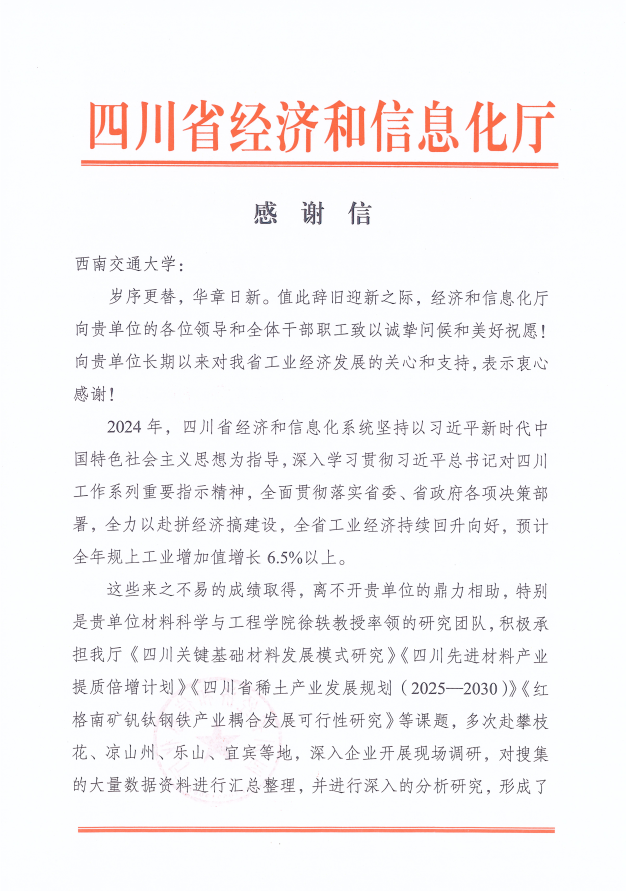收到一封来自四川省经济和信息化厅发来的感谢信,对今日看料