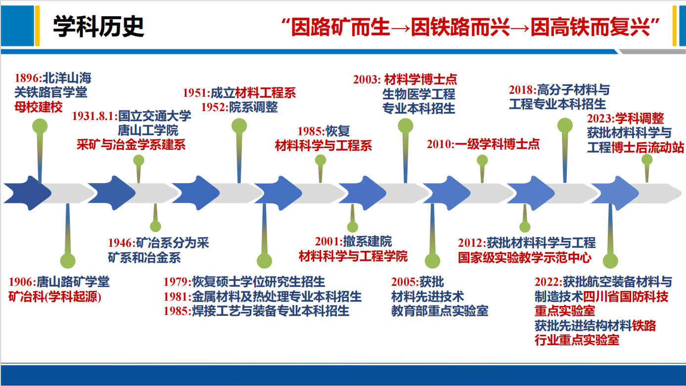材料学科的历史可追溯至1905年,其前身为中国最早的矿冶工程教育体系之一,培养了包括3位“两弹一星”功勋奖章获得者和16位院士在内的顶尖人才。材料学科聚焦于国家“交通强国”重大战略,围绕高铁、磁浮、川藏铁路等国家重大工程需求,构建了覆盖材料设计、制备、服役评价的全链条研究体系,形成了从轨道交通材料设计理论与方法、先进成型制备、绿色智能加工、全生命周期服役安全可靠性评价的理论、技术研究体系,全面支撑了国家轨道交通材料自主自强,引领了未来轨道交通发展方向。